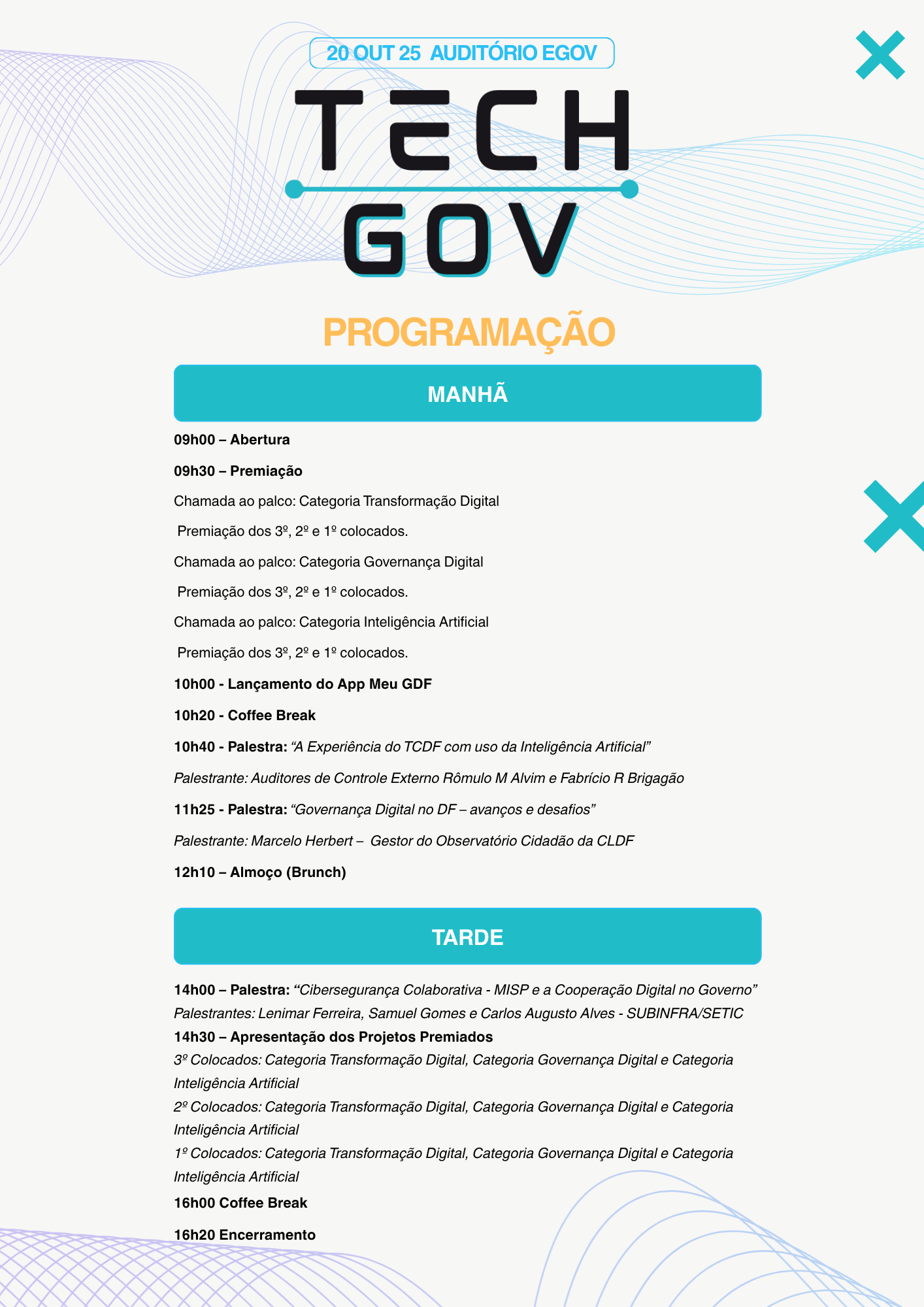 Instituído pela Portaria nº 739, publicada no Diário Oficial do DF, o Reconhecimento Profissional TECHGOV-DF 2025 tem o objetivo de identificar, valorizar e divulgar soluções de tecnologia da informação e comunicação (TIC) já implementadas no âmbito do GDF. A iniciativa reconhece o trabalho dos servidores que, com criatividade e compromisso, desenvolvem soluções inovadoras capazes de gerar valor ao cidadão e aumentar a eficiência administrativa.